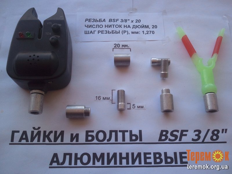 Продам алюминиевые гайки и болты (детали) с резьбой европейского стандарта BSF 3/8 дюйма на 20 витков на дюйм. Именно этот стандарт резьбы используется в производстве рыбацких Род Подов, сигнализаторах поклевки, рыбацких рогачах и во многом другом (рыбацких подсаках, штативах на фотокамерах, палатках и т.д.). Гайки и болты произведены из алюминиевого прутка сплава АМц. Отличающийся высокой свариваемостью и стойкостью против коррозии. Данные алюминиевые детали можно соединять путем сварки, а также заклёпочным инструментом. Номинальный диаметр алюминиевой резьбы (d1), мм: 9,53 Число ниток на дюйм: 20 Шаг резьбы (Р), мм: 1,270 Длина алюминиевой гайки – 20 мм. Внешний диаметр алюминиевой гайки 14,5 мм Цена алюминиевой гайки – 38 грн. за 1 штуку Длина болта: Резьба болта - 16 мм. + шляпка 5 мм. (все как на фото) Цена болта 38 грн. за 1 штуку Если вам необходимы алюминиевые детали другого размера, вы даже в домашних условиях легко можете обработать напильником или другими teremok.org.ua teremok.org.ua teremok.org.ua инструментами данные болты и гайки для нужных вами размеров. Продаются болты и гайки только указанных размеров в объявлении. Дешевле также есть в продаже стальные гайки и болты, 37 грн. за 1 штуку стальной гайки. Фото стальной гайки и болта могу скинуть в сообщении или на электронную почту. Отправка осуществляется в любой регион Укр почтой, Новой почтой, Интайм, Автолюкс и другими курьерскими службами (возможен наложенный платеж). По вашему желанию могу отправить наложенным платежом (оплата на почте при получении товара). То есть вы приходите на почту, лично осматриваете товар, который ранее заказывали. Посмотрев посылку и убедившись, что это именно тот товар, который вы заказывали. Вы на почте оплачиваете стоимость товара, почтовые услуги и забираете ваш товар. Задавайте, пожалуйста, мне любые вопросы, буду рад на них дать ответы. Моб. +38-067-982-09-39 Моб. +38-066-499-17-25 Моб. +38-093-747-02-85 Viber: +380966313686 Skype: s.karnogickiy Email: Ksv37@i.ua