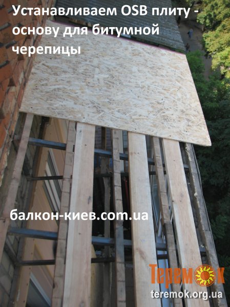 Традиционные материалы для кровли балкона - профнастил, металлочерепица, битумная четепица. В Киеве много балконных крыш выполнено также из ондулина, но мы отказались от применения этого материала, как ненадежного и достаточно дорогого по цене.