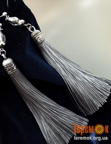 В сірих сережках - використані кришталеві бусини-краплі великого розміру, що гармонійно поєднуються по кольору з китицями.