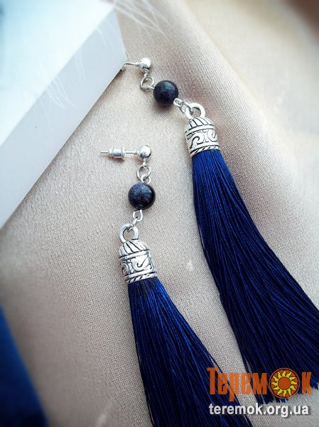 В темно-синіх сережках використано бусину з каміння авантюрину "Каїрські ночі" з золотистими мерехтливими вкрапленнями, що так нагадують південне зоряне небо. Це камінь-талісман удачі та авантюри ( в хорошому розумінні цього слова).