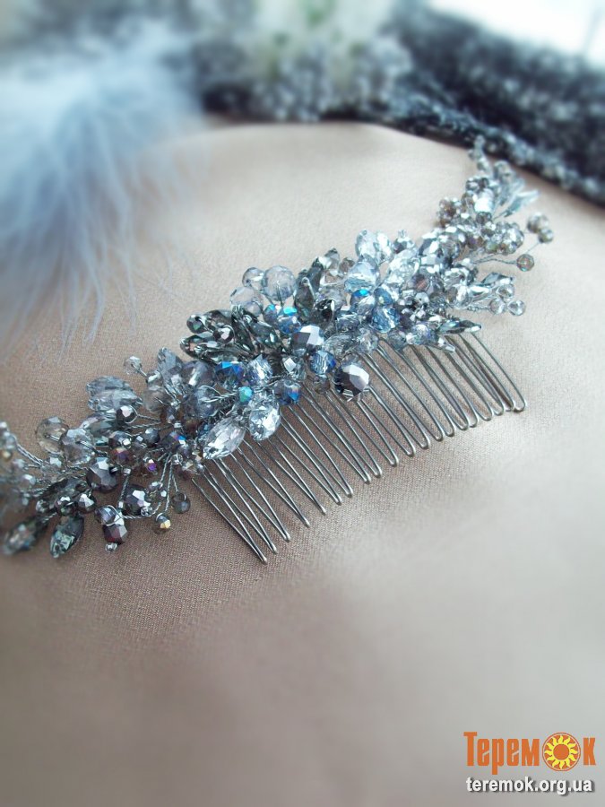 Пышная , густая, шикарная, сверкающая веточка с петельками ( направляющими) и дополнительным креплением в виде большого гребня идеально подойдет для завершения свадебного образа. Изделие выполнено из хрустальных бусин серых оттенков с добавлением серых хамелеонов, которые , при смене угла обзора играют голубовато-фиолетовыми искрами. Использовала много бусин, по этому гребень лучше применять для волос средней и высокой густоты и плотности. У кого волосы тонкие и не густые, перед приобретением данного украшения лучше проконсультироваться со своим стилистом, который будет с вами работать,подойдет ли вам - зависит от желаемой причёски. .
