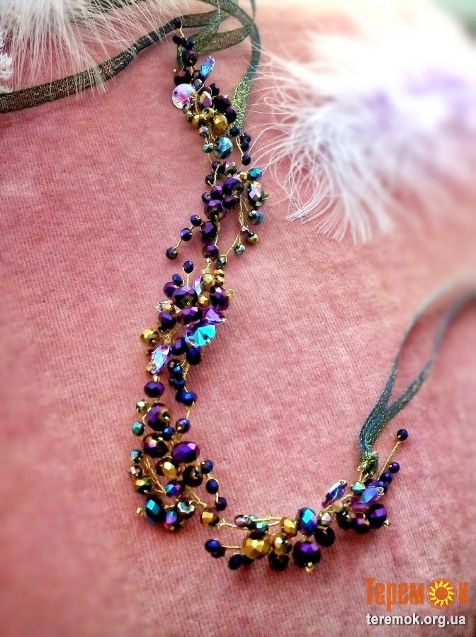 Нова авторська гілочка/віночок "Маріса" виконана з кришталевих намистин яскравих і соковитих сливово-фіолетових відтінків у поєднанні з золотисто- райдужними акцентами. Кристали хамелеони змінюють своє забарвлення в залежності від кута огляду і неймовірно виблискують. На кінцях гілочки прикріплена парчова стрічка, що легко знімається, завдяки якій прикрасу можна використовувати у вигляді віночка/ гнучкого обідка.
