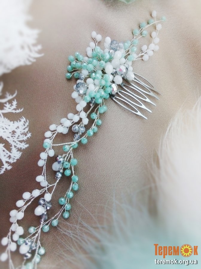 Состав: хрустальные бусины - бирюзово-мятные, белые, серебристые., фурнитура цвета серебра, малый гребень стального цвета.