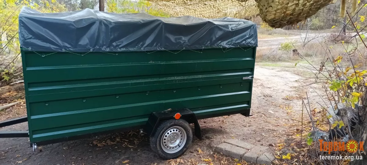 Усиленный одноосный прицеп Днепр-300. Под усилением подразумевается: борт обшит профильной трубой, профильные перемычки на дне прицепа,рессора выдерживает 1.5 т.