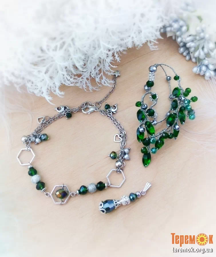 Авторські Ельфійські каффи (дизайн Дивнолісся) в простому кольорі - зелений і смарагдовий. Кристали в насиченому зеленому кольорі зкомбіновано з кришталевими зеленими намистинами із вкрапленнями срібного. В роботі використано полегшені кристали з ювелірним грануванням для зниження ваги прикрас і комфортного носіння. Вони мають надзвичайний блиск та змінюють насиченість залежно від освітлення.