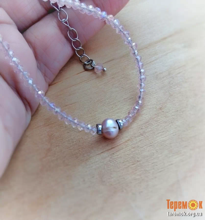 Матеріали: ювелірний тросик, металева та стальна фурнітура, натуральна річкова перлина, намистини із кришталю та натурального каменю (гематит).