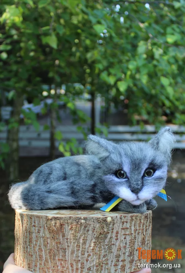 Котик сірий валяна іграшка інтерєрна з шерсті. Висота 11 см, длина 20 см + хвіст 19 см. Очі скляні ручного розпису, носик з полімерної глина fimo ручної лепки і ручного розпису, вуса мононіть. Кот іграшка валяна дуже приємна на дотик, пухнаста та м'ягка. Зроблена в одному екземплярі, ексклюзивна. Іграшки з вовни це дуже особисті, наповнені любовю мастера, вони живі . Стане чудовим доповненням вашого інтеоєру, будуть дарити гарний настрій на довгі роки! Шукає новий будиночек.