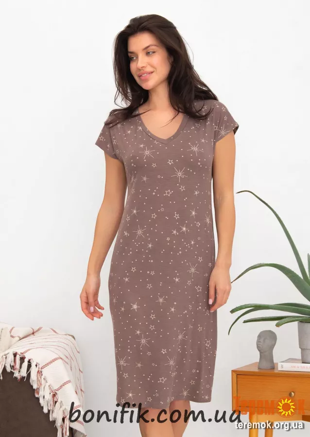 Нічнушка довжиною вище колін, вільного силуету, з коротким рукавчиком. Виріб прикрашено принтом сузір'я.