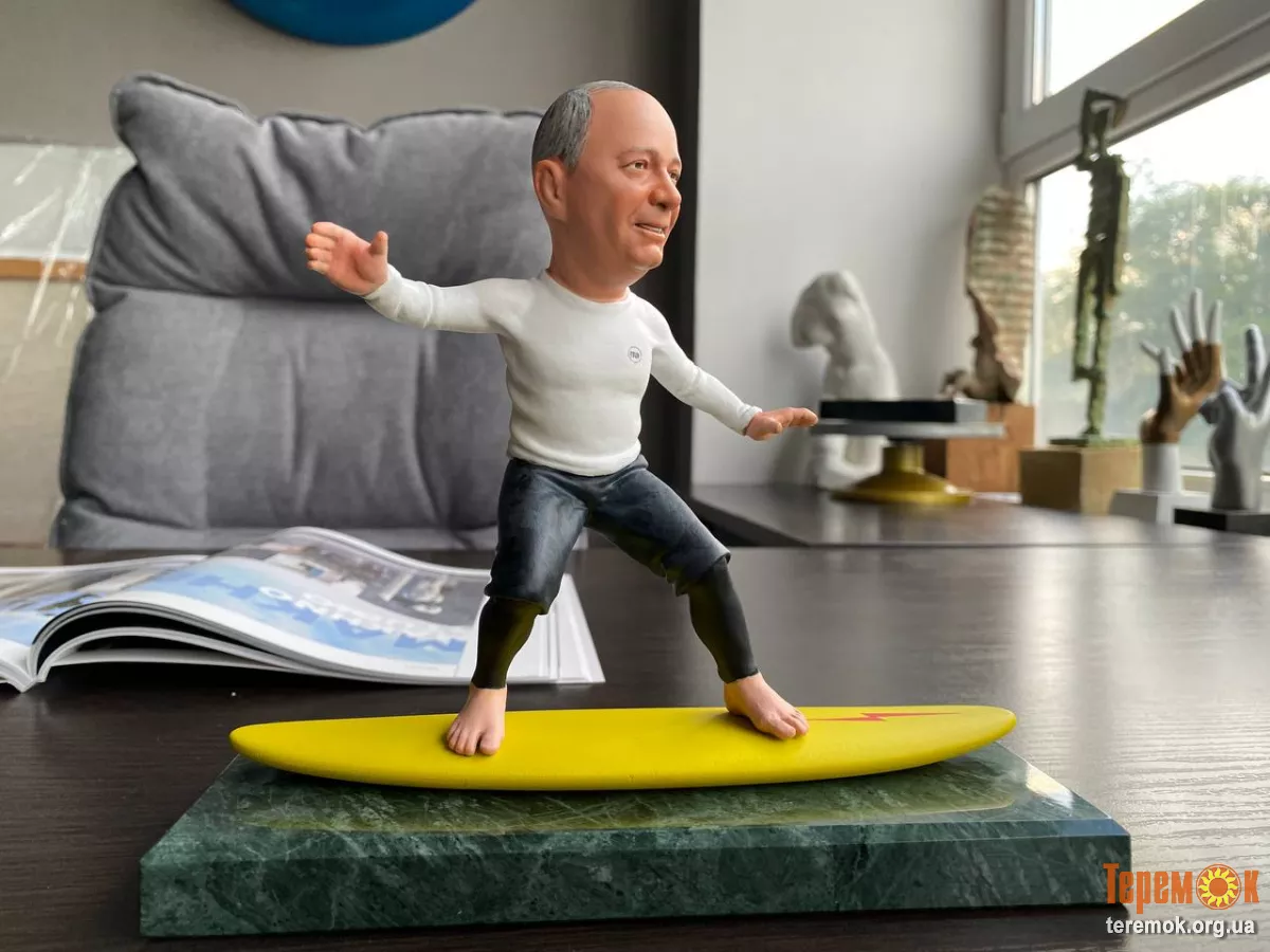 Студия «ОМИ» рада представить уникальное искусство в мире подарков - персональные шаржевые статуэтки на заказ. Мы не только создали неповторимую статуэтку серфингиста на серфе, но и придаем ей портретное сходство по фотографии вашего выбора.