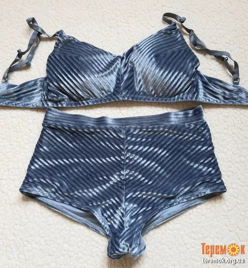 Отличный костюм для занятия спортом, танцами, а так же можно использовать как купальник. Топ и трусы высокая посадка. Материал мраморный бархат металлик, смотрится шикарно. Фото нашла в синем цвете. Материал тянется. Топ и трусы полностью. на подкладке. В топе вставлены уплотненные чашечки. Размер указан на бирке топа и трусов AUS 10; US 6; EUR 38. Замеры трусов: ПОТ 32- 36 см., ПОБ 38-44 см., высота посадки 30 см., длина по боку 19 см. Замеры топа: обхват под грудью растягивается до 75 см, высота бретелек регулируется. Сток. Состояние идеальное