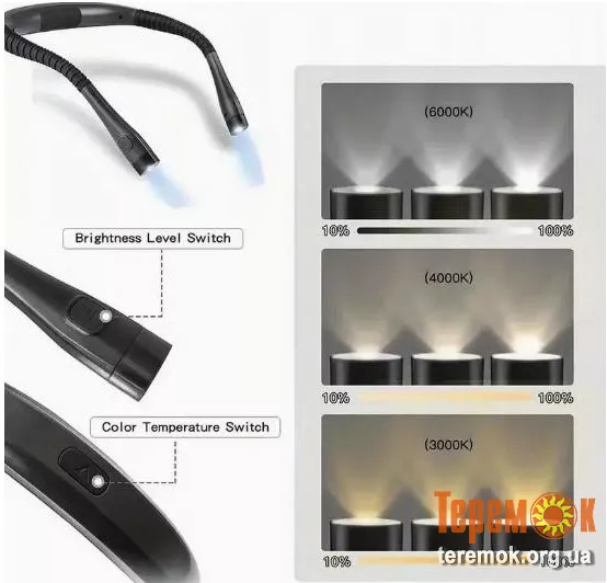 Кожна головка має незалежний перемикач для 3 рівнів яскравості, які можна регулювати. Ви можете вибрати зручне налаштування, яке вам потрібно для читання, в'язання, кемпінгу або ремонту тощо