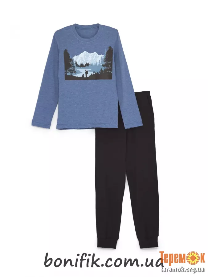 Комплект піжами складається з напівприталенної кофти та штанів. Піжама виготовлена из м'якої кольорової бавовни з додаванням малюнку гірського пейзажу.