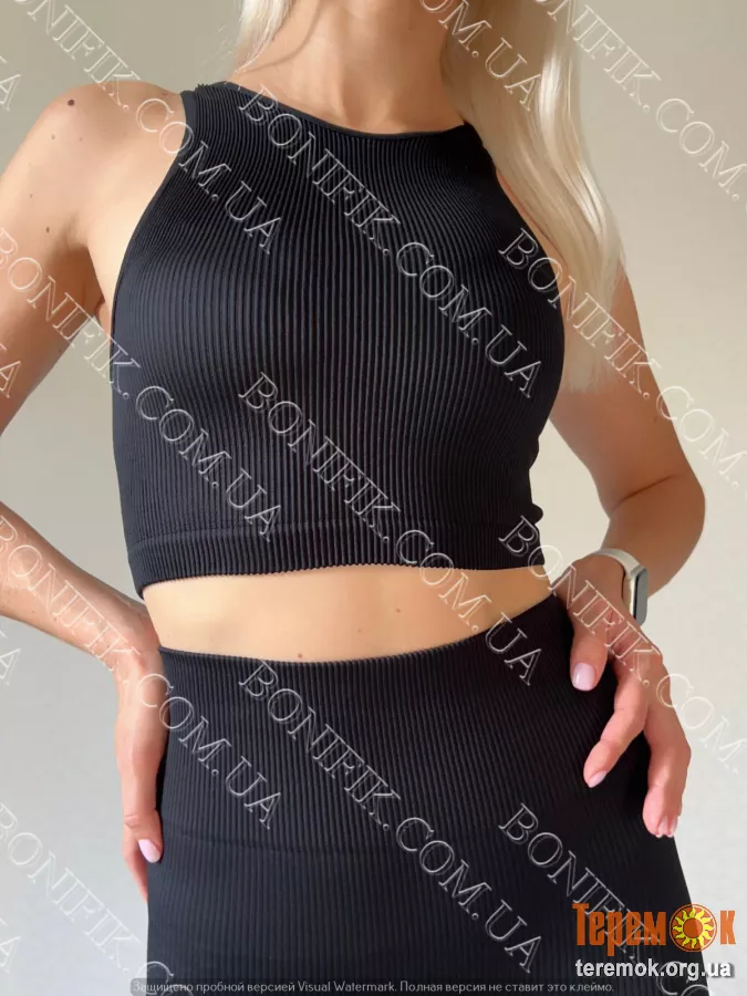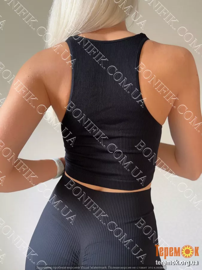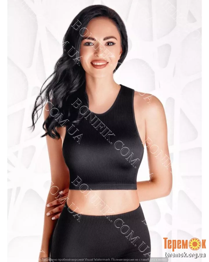 Модель топа виготовлена із високоякісної мікрофібри в чорному кольорі, з використанням кругової в'язки без сшивання бокових швів.