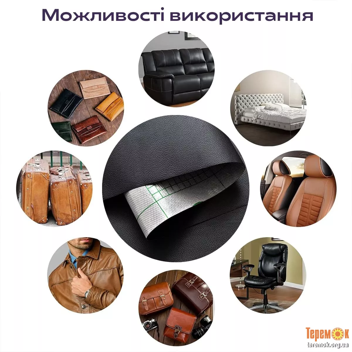 Призначення: ремонтно-оздоблювальні роботи та декорування. Матеріал може використовуватися у різноманітному ремонті дверей, м’яких меблів та стільців, деталей салонів автівок, сидінь велосипедів та мотоциклів, а також для реставрації шкіряно-галантерейної продукції та одягу.