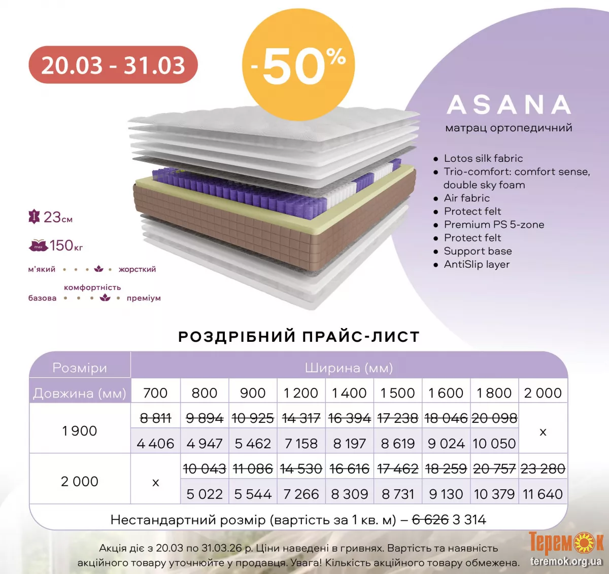 Вартість розмірного ряду матраца Lotоs зі знижкою 50%: