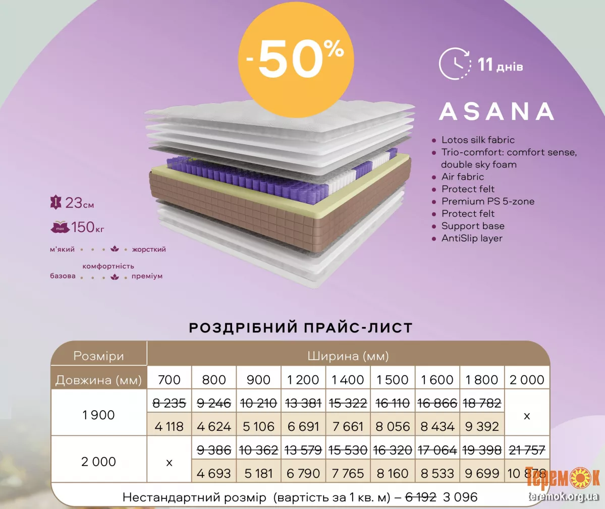 Вартість розмірного ряду матраца Lotоs зі знижкою 50%:
