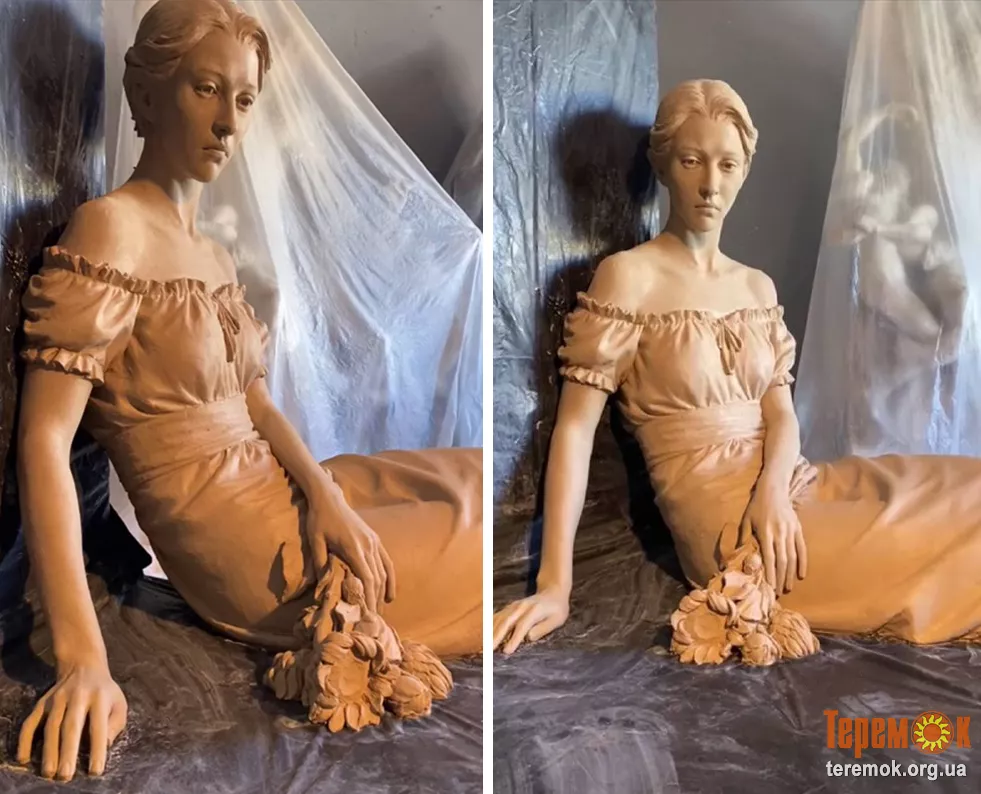 Скульптура изображает женщину, глубоко опечаленную утратой, её образ наполнен чувством скорби и сострадания. Она сидит на гранитном надгробии, нежно держа в руках цветы — символ памяти и вечной любви. Особенностью этого произведения является изысканное сочетание эмоций и высокого мастерства, что позволяет воспринимать скульптуру как не просто памятник, но и произведение искусства.