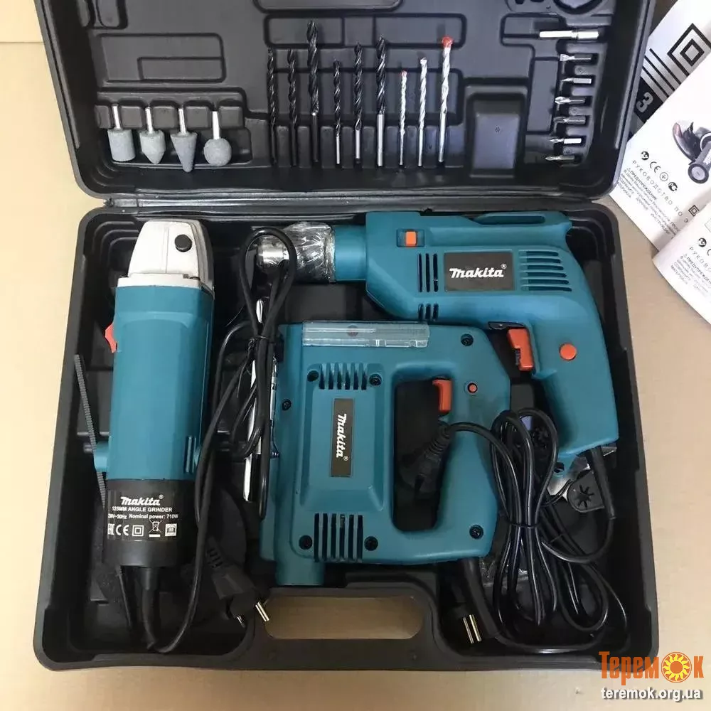 Комплект makita 3 в 1 дриль, лобзик, болгарка