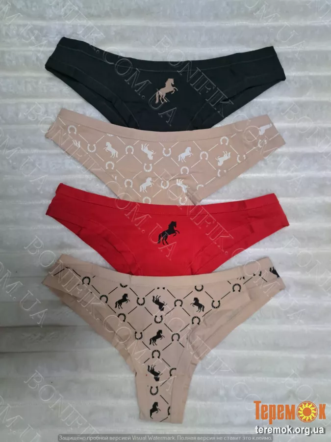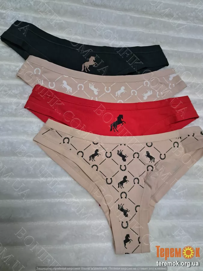 В упаковці із 4 трусів різного кольору з малюнком конячки і підков. Чудовий варіант для повсякденної носки в літній сезон.