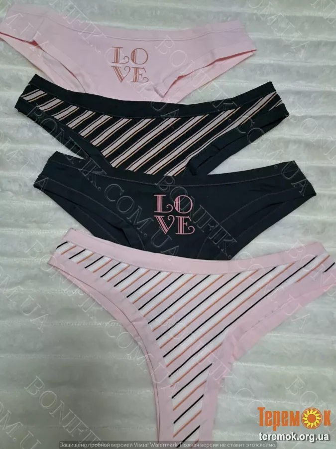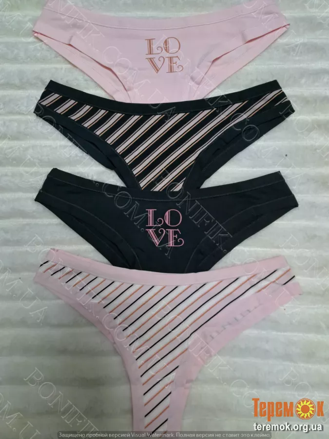 Бавовняні жіночі трусики-бразиліани (у наборі 4 штуки в упаковці) у палитрі кольорів (чорний, рожевий), декоровані принтом-написом LOVE і в кольорову смужку.