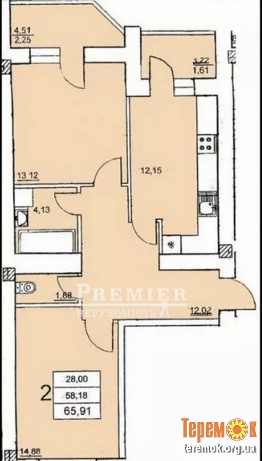 Загальна площа квартири 66 кв.м., житлова 28 кв.м., кухня 12 кв.м.