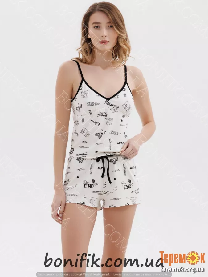Комплект піжами приталенного кроя, складається із маєчки на тонкій бретелі та шортиків.