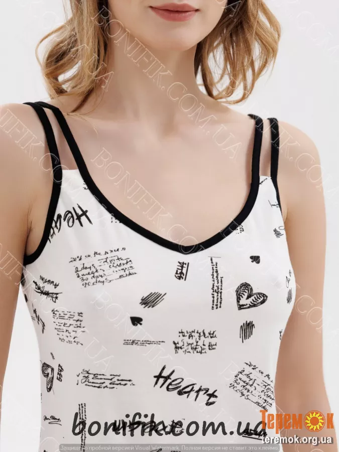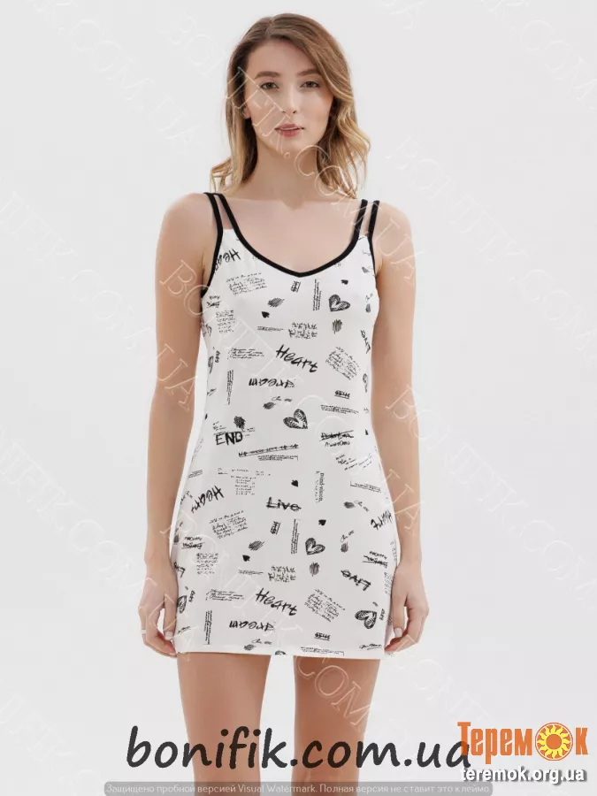 Нічнушка виготовлена з бавовни білого кольору, має приталенний силует, на тонких чорних бретелях, прикрашена малюнком "написів".