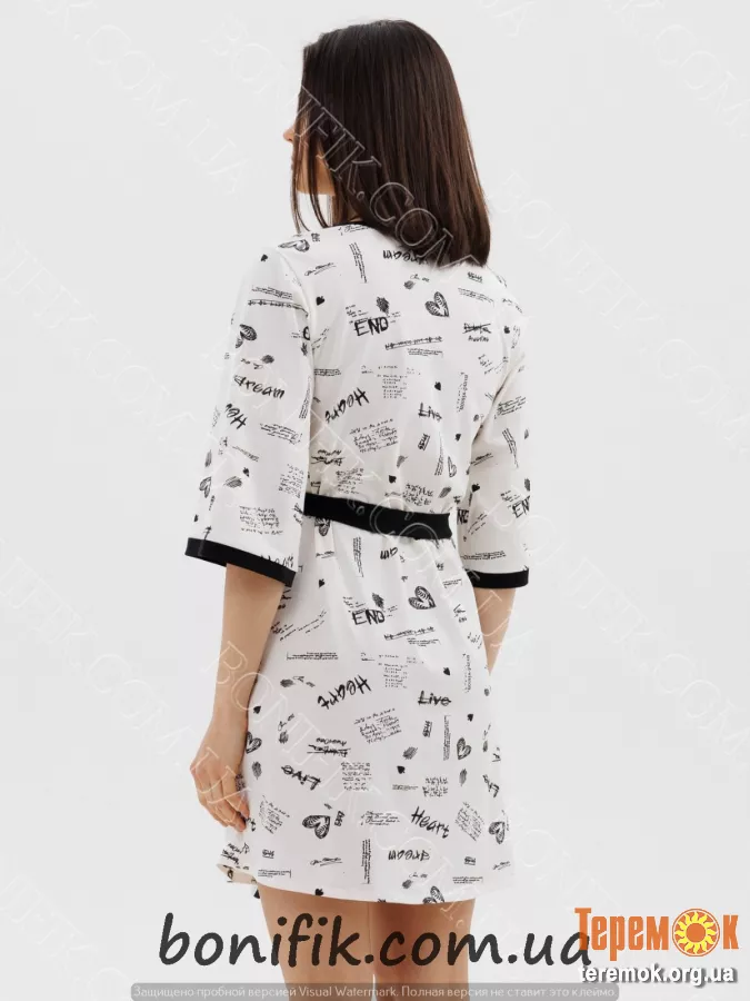 Халат має вільний крій, що приносить максимальний комфорт для будь-якої фігури. Халат зав'язується на пояс, рукава довжиною 3/4.