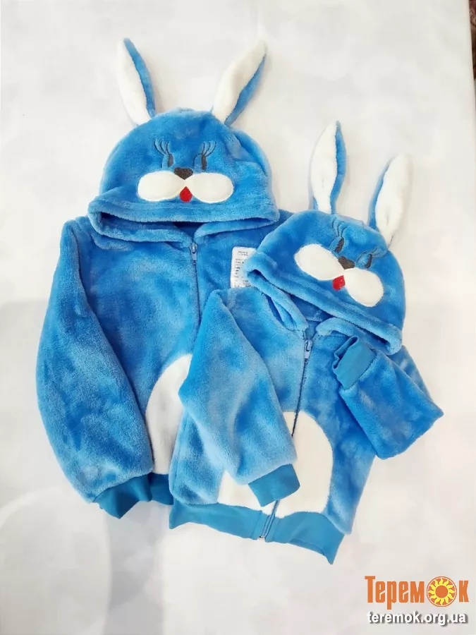 Капюшон з вушками та вишитий аплікацією мордочки зайця.