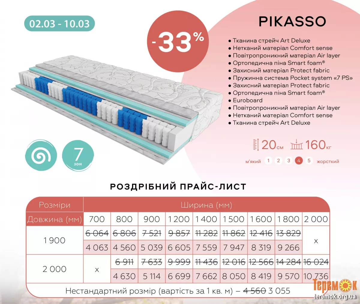 До 10 березня діє приємна акція зі знижкою 33% на весь розмірний ряд матраца!