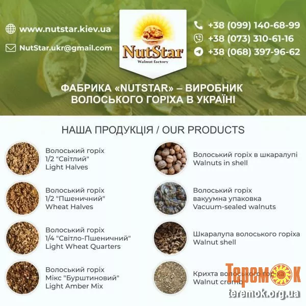 Фабрика "NutStar" - виробник волоського горіха в Україні - пропонує у продаж волоський горіх цілий та лущений: