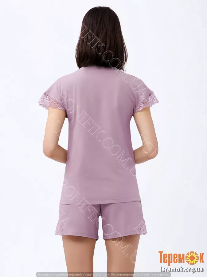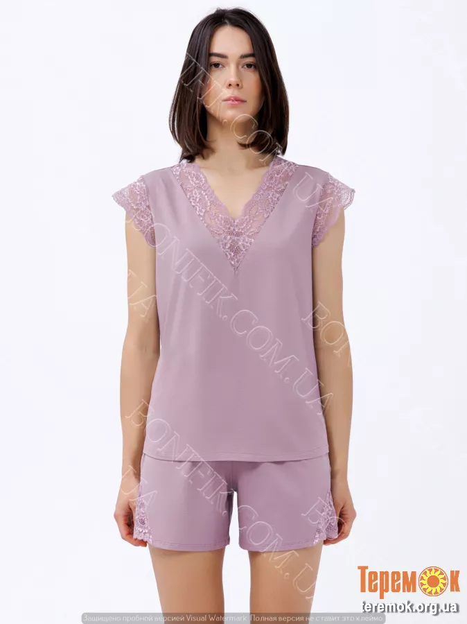Комплект складається з футболки приталенного крою, з короткими рукавами із мережива та мереживними вставками в зоні декольте.