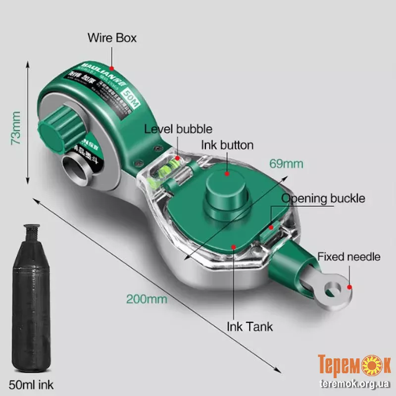 Професійний будівельний рівень з функцією нанесення лінії чорнилом — ідеальний інструмент для точних вимірювань та маркувань у будівництві, столярних і ремонтних роботах. Завдяки двошаровій чорнильній камері, зносостійкому шнуру та міцному корпусу з фотоелектричної смоли, цей інструмент гарантує довговічність, точність та зручність у використанні.