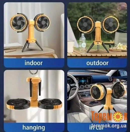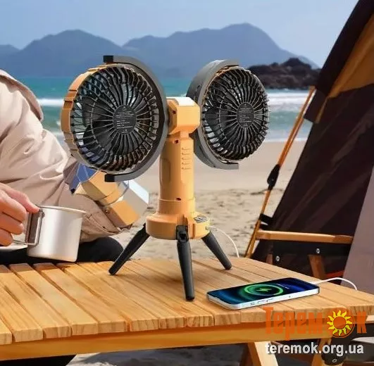 - Теги: вентилятор для намету, вентилятор з гачком, триножний вентилятор, вентилятор з USB зарядкою, вентилятор двоголовий, портативний вентилятор, настільний вентилятор, вентилятор з LED підсвіткою, вуличний вентилятор, кемпінговий вентилятор