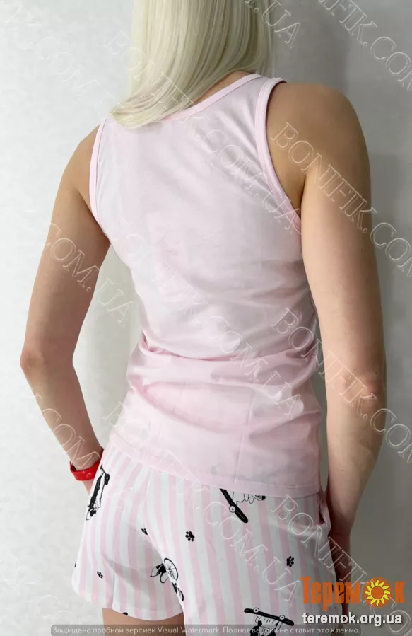 Комплект піжами, приталенного силуету, складається із майки на широкій бретелі, з малюнком собачки спереду.