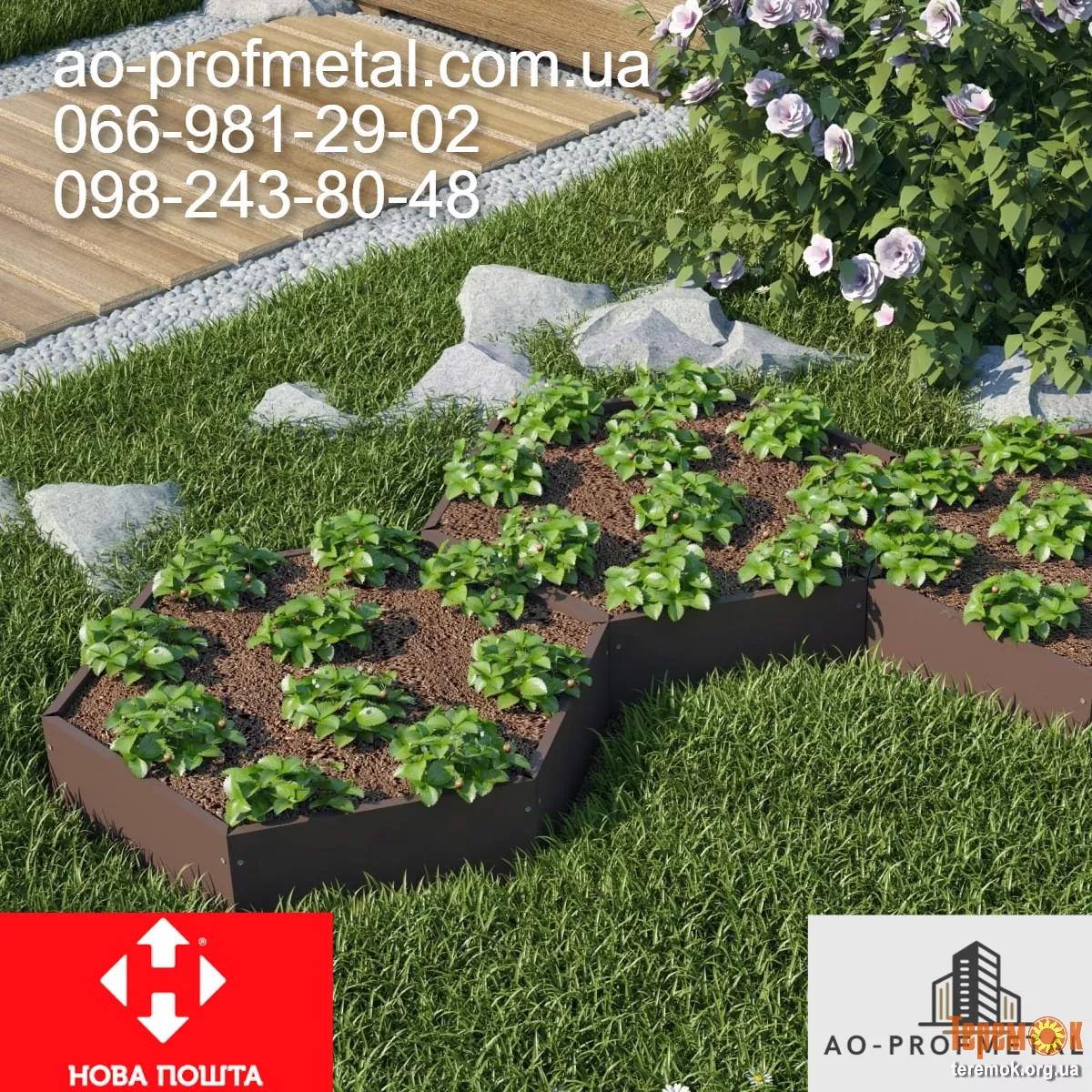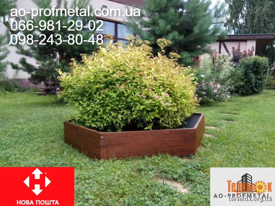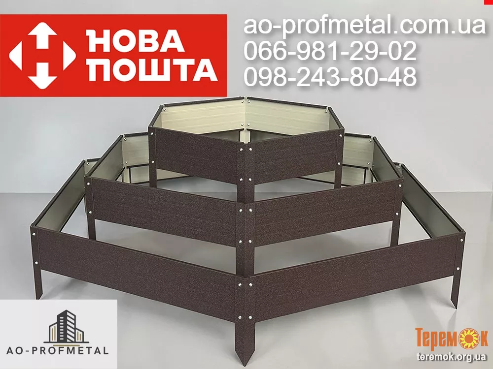 Клумбы металлические, разборные, оцинкованные. Высота 190 мм, ширина любая. Огромная цветовая гамма металла, под камень, дерево, мат, глянец вся табл