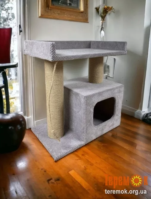 Такой домик - очень понравится Вашим котикам, а особенно если у Вас их двое. Эта модель самая популярная среди заказчиков у которых не одно животное. Такой комплекс занимает немного места, очень компактный и выглядит очень круто, особенно в этом цвете, ткань как бархат. Так как это мебельный материал он отлично впишется в Ваш интерьер. Очень Важный плюс, что сверху домика есть лежак есть лежак, для отдыха и наблюдения за домочадцами)