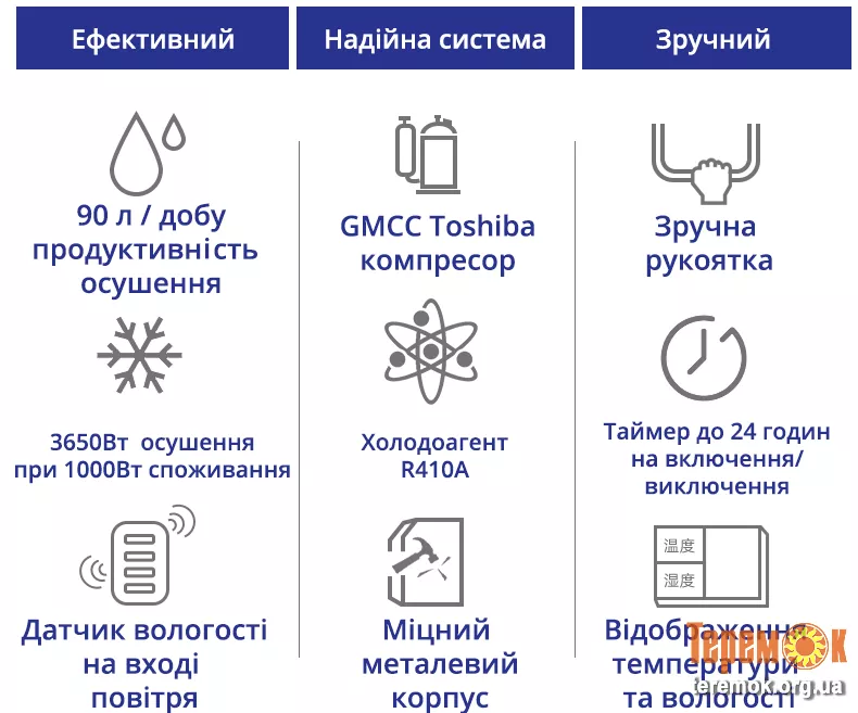 * Висока продуктивність: осушення до 90 літрів вологи на добу.