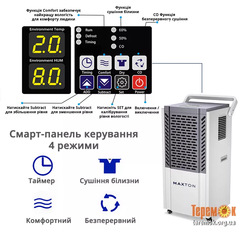 Maxton MX-90L – ідеальний вибір для великих промислових, комерційних та житлових приміщень. Забезпечте ефективний контроль вологості та комфортне середовище вже сьогодні!