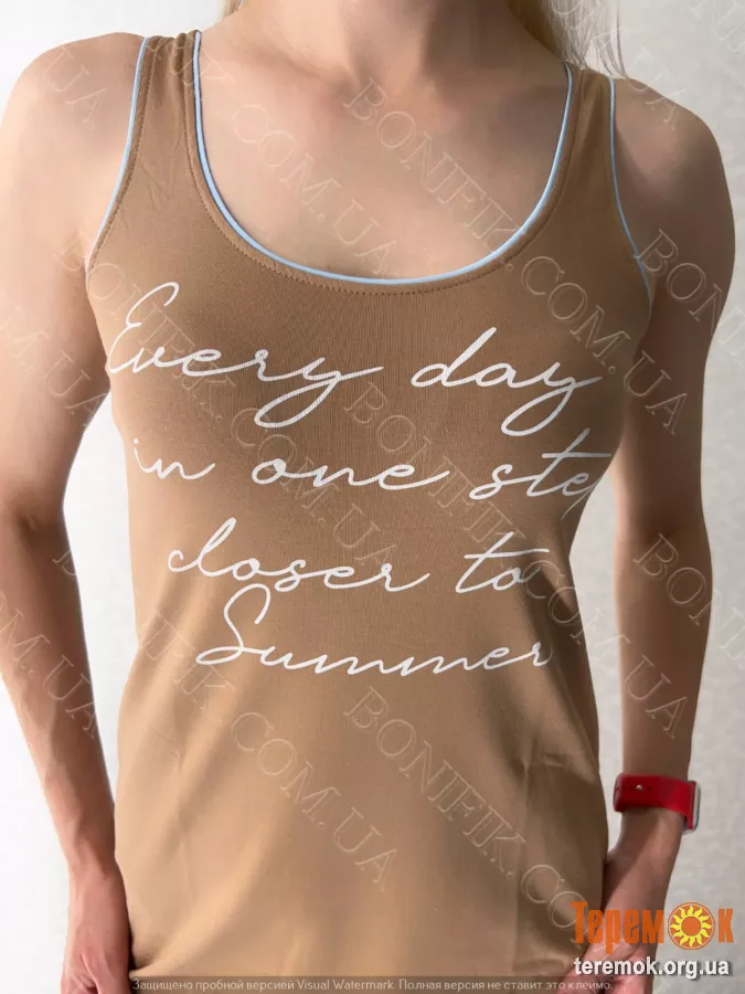 Оригінальний білий напис "Every day I'm one step closer to Summer" надає образу легкості та надихаючий настрій.