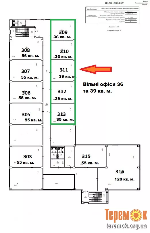 Крім цього, є вільні офісні приміщення різної квадратури від 39 до 650 кв. м.
