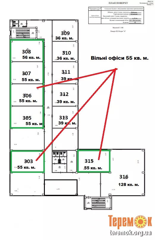 Здаються в довгострокову оренду офісні приміщення від 55 кв.м., якє розташоване на третьому поверсі.