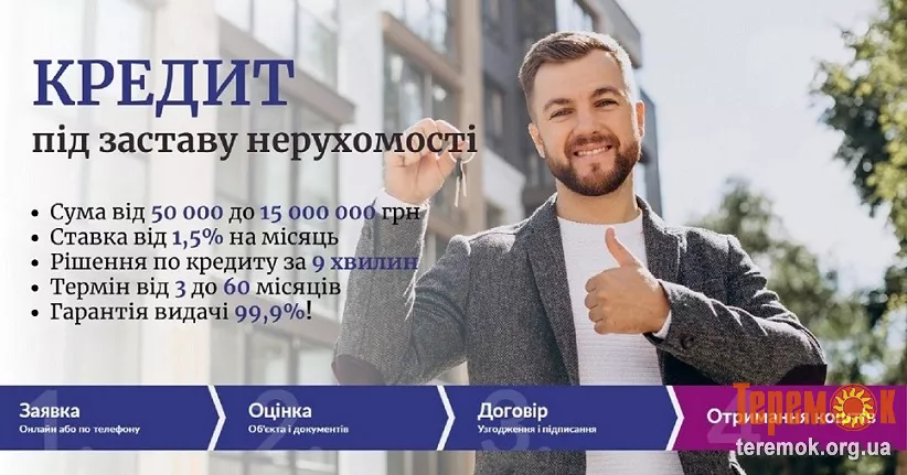 Видача до 80% від ринкової вартості застави. Сума позики до 15 000 000 гривень з можливістю дострокового погашення.