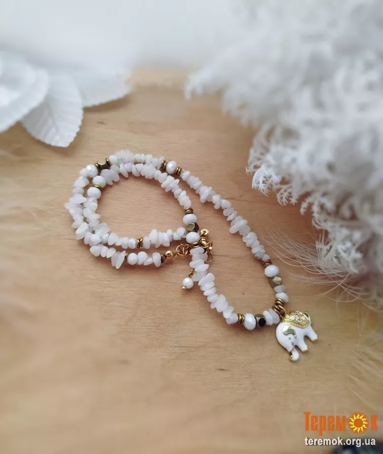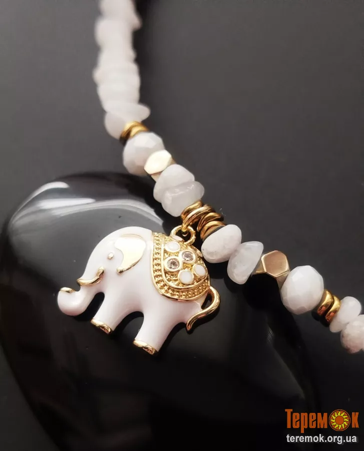 Склад: ювелірний тросик, сталева фурнітура, натуральний полірований гравій нефрит/жадеїт біло- молочний, золотистий гематит (камінь-мінерал), кришталеві намистини 6 мм, підвіска слон латунний з емалю оздоблений цирконами.