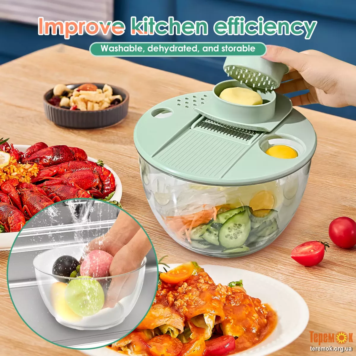 • Багатофункціональність: миття, сушіння та нарізка овочів