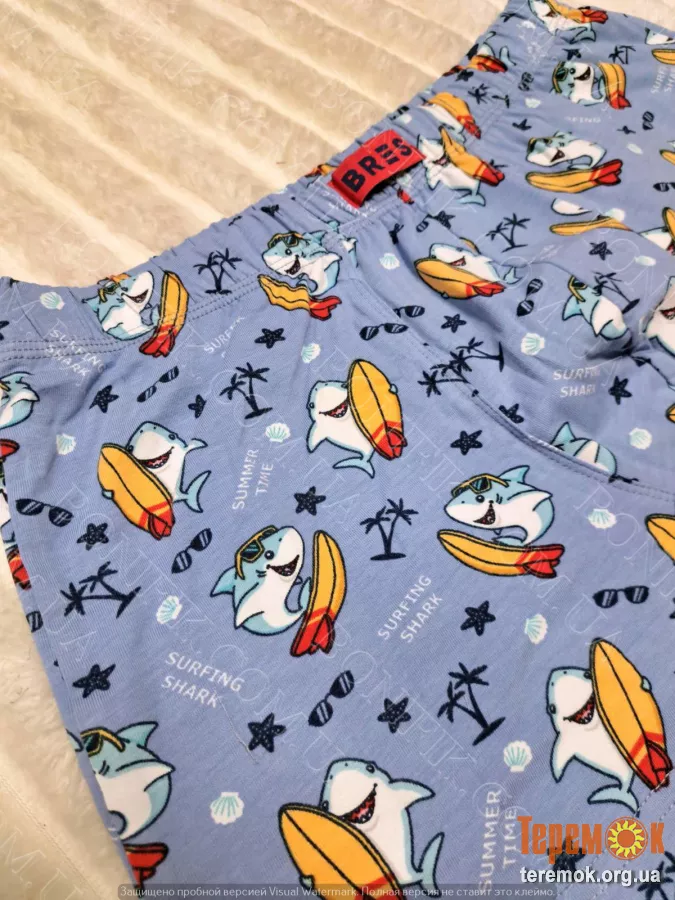 Блакитна тканина прикрашена яскравим літнім принтом – акули-серфінгісти, дошки, пальми і сонячні мотиви, що додають настрою і роблять білизну надзвичайною.