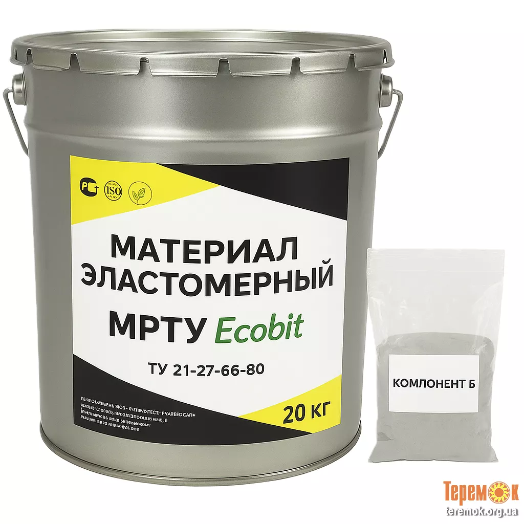 Мастика МРТУ Ecobit ГОСТ 30693-2000 ( ДСТУ Б В.2.7-116-2002) жидкая резина это двухкомпонентное эластомерное покрытие изготовленное из высококачественных каучуков для устройства бесшовной кровли, гидроизоляции и антикоррозионных покрытий. Покрытие наносится в жидком виде валиком, кистью либо оборудованием безвоздушного распыления и образует после отверждения прочную, эластичную и полностью водонепроницаемую мембрану. Покрытие может быть использовано для ремонта кровель