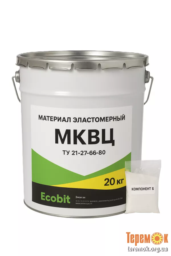 Кровельная 2-х компонентная гидроизоляционная мастика МКВЦ Ecobit ТУ 21-27-66-80 это двухкомпонентное эластомерное покрытие изготовленное из высококачественных каучуков для устройства бесшовной кровли, гидроизоляции и антикоррозионных покрытий. Покрытие наносится в жидком виде валиком, кистью либо оборудованием безвоздушного распыления и образует после отверждения прочную, эластичную и полностью водонепроницаемую мембрану. Покрытие может быть использовано для ремонта кровель