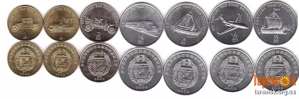 Набір із 7 монет Північної Кореї 2002 р (транспорт). Номінал - 1/2 чона. Стан UNC.