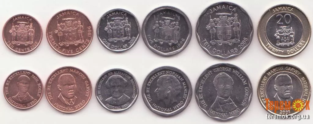 Набір із 6 монет Ямайки 1996-2008 рр - 10, 25 центів та 1, 5, 10, 20 доларів. Стан UNC.